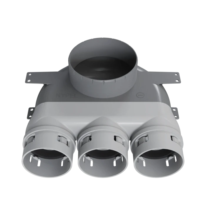 Skrzynki rozprężne PE-FLEX PP oferowane są w wersjach umożliwiających montaż systemowych przewodów wentylacyjnych PE-FLEX o średnicach zewnętrznych Ø50, Ø75 i Ø90 mm. Ilość podłączonych przewodów powinna wynikać z zapotrzebowania na ilość przepływającego powietrza, a niewykorzystane mufy przyłączeniowe mogą zostać zaślepione oryginalnymi zatyczkami PE-FLEX.