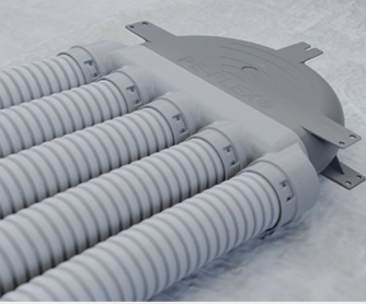 - Ustandaryzowana średnica zewnętrzna króćca skrzynki rozprężnej to Ø 123 mm pozwala na stosowanie dedykowanej przedłużki PE-FLEX lub innych przewodów o średnicy Ø 125 mm